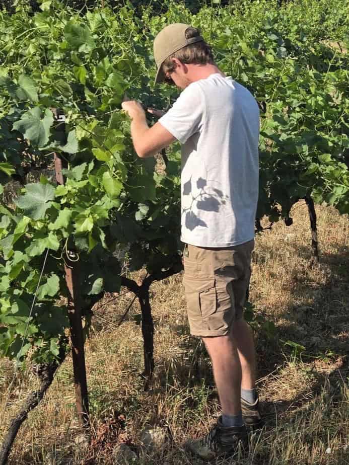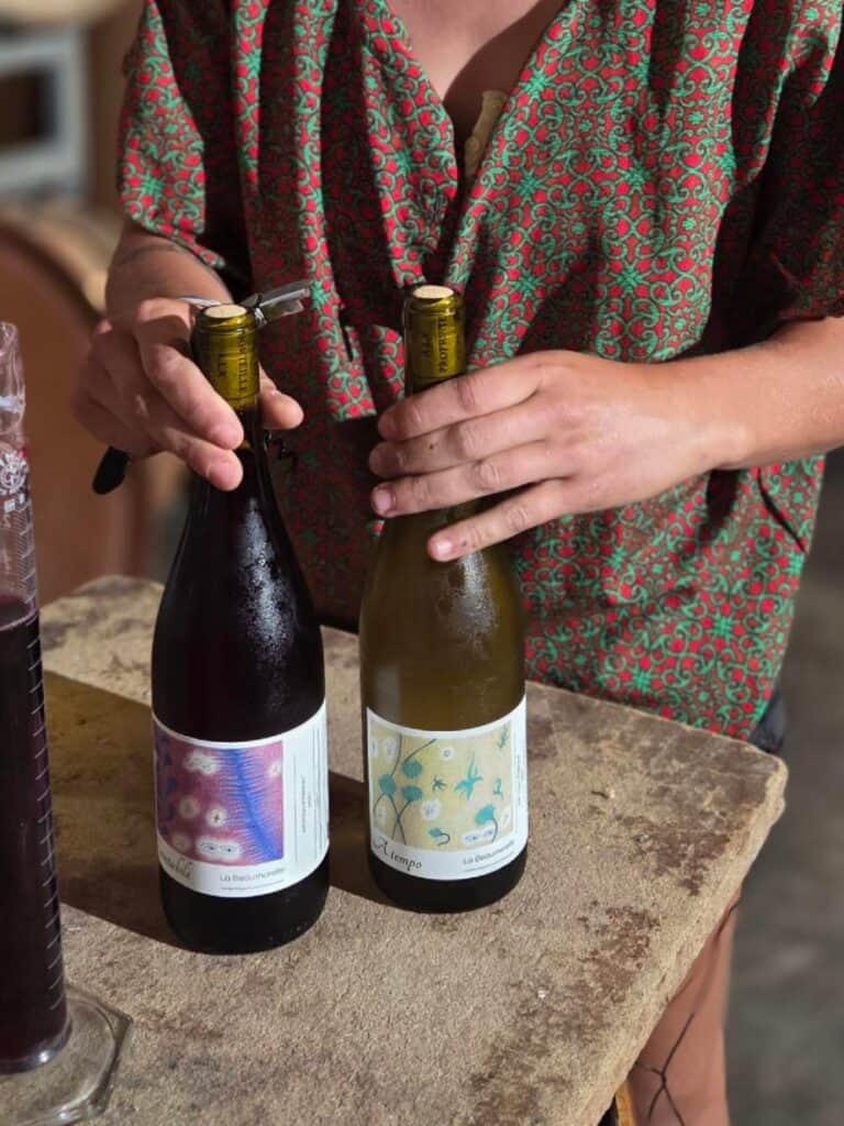 Camille: “Les cépages cultivés propres à l’appellation sont: le Carignan Noir, la Syrah et le Grenache. Alain Caujolle-Gazet, précédent vigneron, avait planté du merlot et du Pinot Noir. Tu vois que nous n’avons pas de cépages blanc!? et oui on teste et on s’essaie au blanc de noir avec le Pinot Noir!”